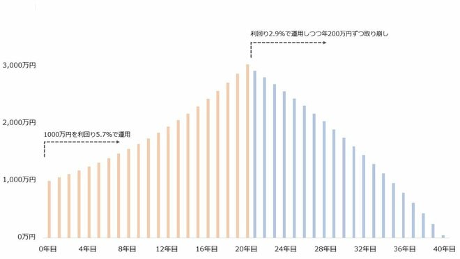 例えば1000万円を20年間で3000万円にまで増やす目標を立てたとき、必要な利回りは5.7%です。さらに増やした資産で年200万円の取り崩しを20年間行うなら2.9%の利回りが求められます。