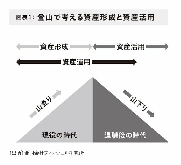 もう少しわかりやすくするために、登山で考えてみましょう。図表1のグラフを見てください。向かって左側が山を登る局面ですが、この時期を資産形成と考えます。山を登る時期は主に現役世代で、資産の大きさを山の高さになぞらえれば、いかに高い山に登ることができるかが大切になってきます。しかし、どのように登るのか、どんなルートで登るのか、どんな装備を用意するのかといったことは登る山の高さや難しさに左右されます。