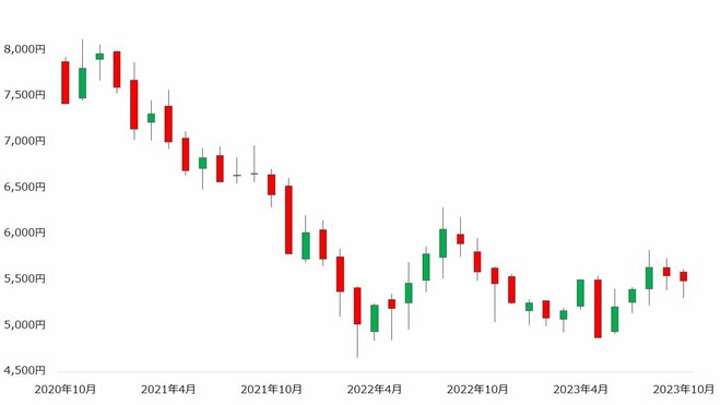 花王の株価が低迷しています。2020年に8000円前後だった株式は値下がりが続いており、現在は5000円台で取引されています。足元で続く減益が嫌気されているのかもしれません。