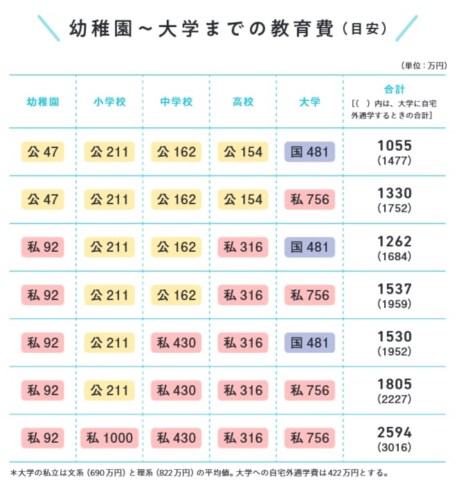 子どもの教育費は、幼稚園から大学まですべて国公立の学校に通った場合で1人あたり約1000万円といわれます。私立に進学したり、子どもが複数いたりすればその分増えます。