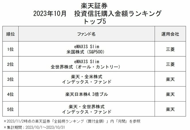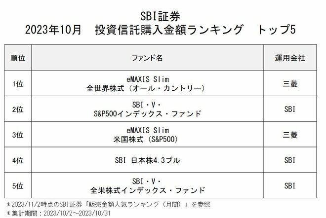 SBI証券のランキング8位に、「SBI・iシェアーズ・インド株式インデックス・ファンド」がランクインしている。同ファンドは、インドを代表する株価指数である「S&P BSE SENSEXインデックス(配当込み、円換算ベース)」の値動きに連動する投資成果をめざすインデックスファンドである。同ファンドはSBIアセットマネジメントが9月22日に設定し、10月末には純資産残高が100億円を突破した。同ファンドはSBI証券のみでの販売だったものの、2023年9月7日~21日までの当初募集機関で50.7億円の資金を集め、今年設定されたインデックスファンドの中で最大金額での当初設定となった。
