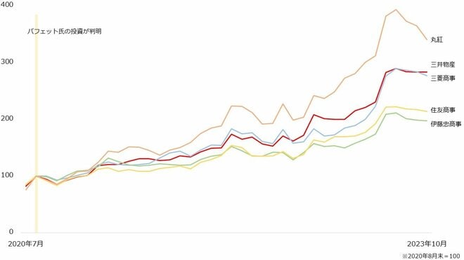 バフェット氏の投資が判明してからの五大商社株は好調です。いずれも右肩上がりに上昇しており、株式は投資が判明した2020年8月の2~3倍の価格で取引されています。