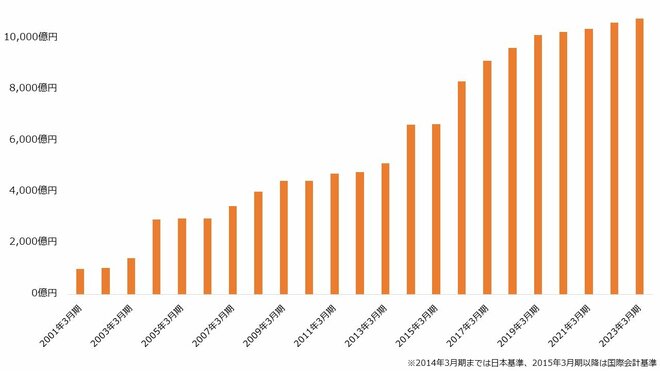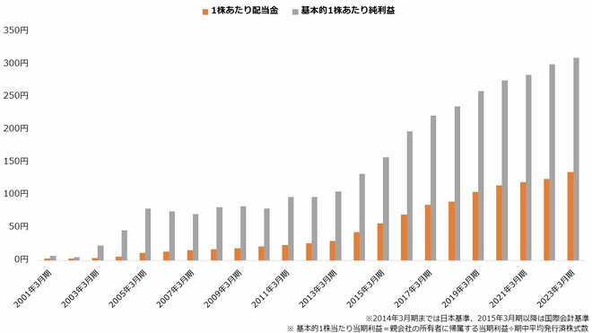 配当も堅調です。増配こそ2002年3月期に見送っていますが、減配や無配に陥ったことはありません。純利益が減少した年も配当金を増やしており、連続増配の記録は2023年3月期で21に達しました。