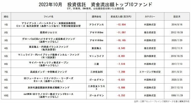 10月の資金流出額1位は「アライアンス・バーンスタイン・米国成長株投信Cコース毎月決算型(為替ヘッジあり)予想分配金提示型」