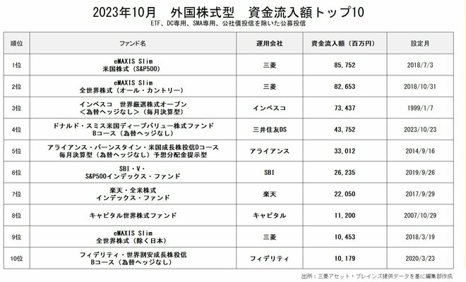 外国株式型の資金流入額1位は「eMAXIS Slim 米国株式(S&P500)」(857.52億円)
