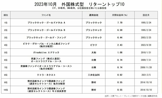 外国株式型のリターン1位は「ブラックロック・ゴールドメタルA」(7.70%)