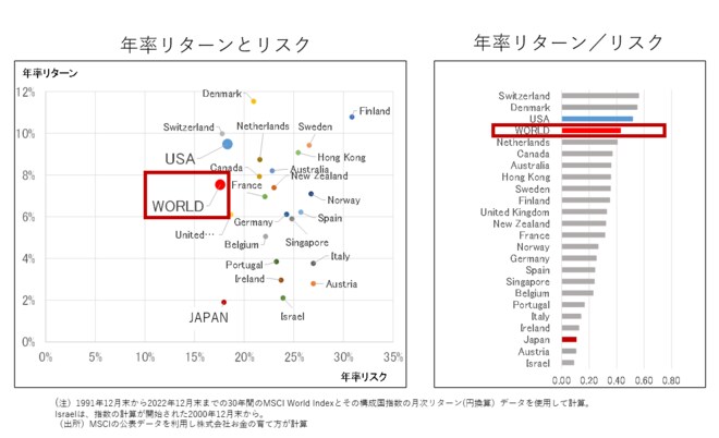 (注)1991年12月末から2022年12月末までの30年間のMSCI World Indexとその構成国指数の月次リターン(円換算)データを使用して計算。Israelは、指数の計算が開始された2000年12月末から。