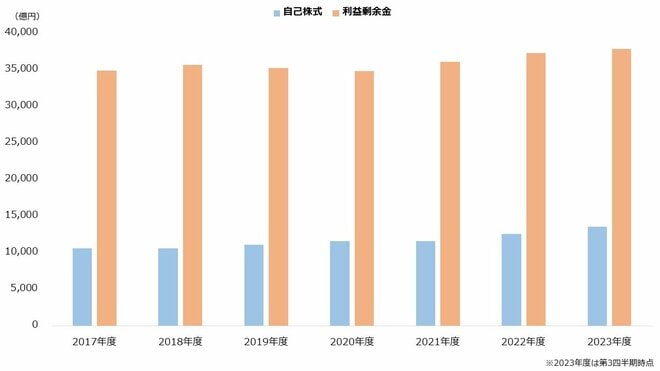 【自己株式と利益剰余金の推移(2017年度~2023年度)】