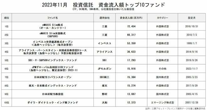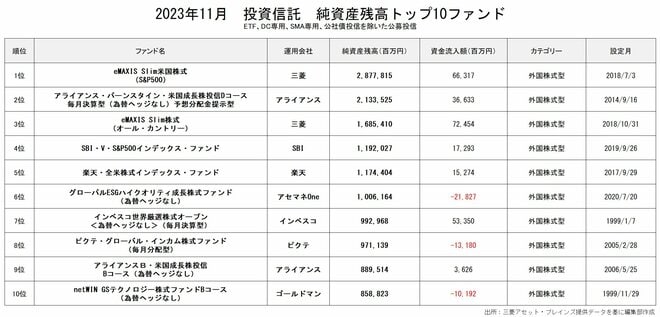 「eMAXIS Slim 全世界株式(オール・カントリー)」の純資産残高は1兆6854.1億円となり、公募投資信託(ETF除く)の中で3位だった。11月は、同ファンドに724.54億円の資金流入があり、「eMAXIS Slim 米国株式(S&P500)」を上回り、初めて資金流入額トップになった。