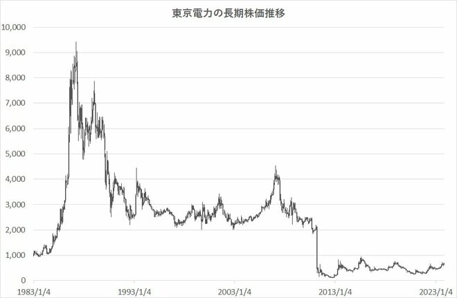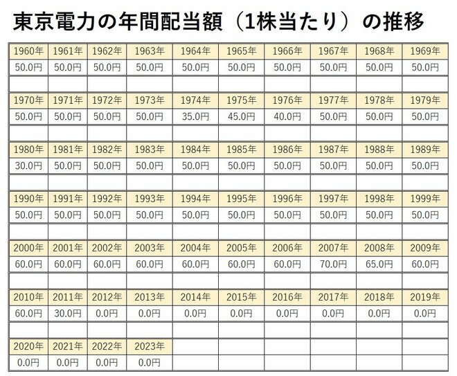 東京電力は、2000年ごろまでは国内上場株式の中で安定配当、安定株価の代表的な存在といえた。実際に、東京電力の配当金は、ずっと1株当たり年間50円だった。オイルショックなどで一時的に減配されることはあったが、1999年に至るまで50円を継続する。40年以上にわたって1株あたり50円の配当を続けていた。そして、2000年以降は1株当たり60円に増配する。その当時、東京電力はトヨタ自動車と並んで個人投資家が投資したい株式のトップに君臨していた。株価の方は、1983年までは1000円前後の株価だったものが、バブル時には9140円(1987年)という高値を記録し、バブル崩壊によって2020円(1999年)まで下落するなど、大きな変動を経験したものの、配当だけは安定していた。40年、50年と続いていた配当が、東日本大震災の折の原発事故で一気に無配(配当ゼロ)に転落し、いまだに復配のめどが立たない状況が続いている。