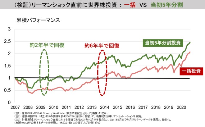 お二人の方が不運にもリーマン・ショックの直前に世界株投資を開始しました。そのうちお一人は、一括して投資を行いました。もう一人の方は、投資開始後に株価下落に遭遇して後悔するのが嫌だったので、5年間毎月60回に分けていわゆるドルコスト平均法で等金額分割投資をしました。お二人の投資成果にはどのような違いが生じたでしょうか。以下のグラフをご覧ください。
