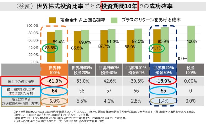 世界株への投資比率を100%まで高めると、最大損失は60%を超えますが、6年強の時間はかかるものの、その損失は時間でカバーできています。一方で平均では預金金利を年率約7%上回る運用成果をあげていますが、預金金利を上回る確率は83%にまで低下し不確実性は増すことになります。