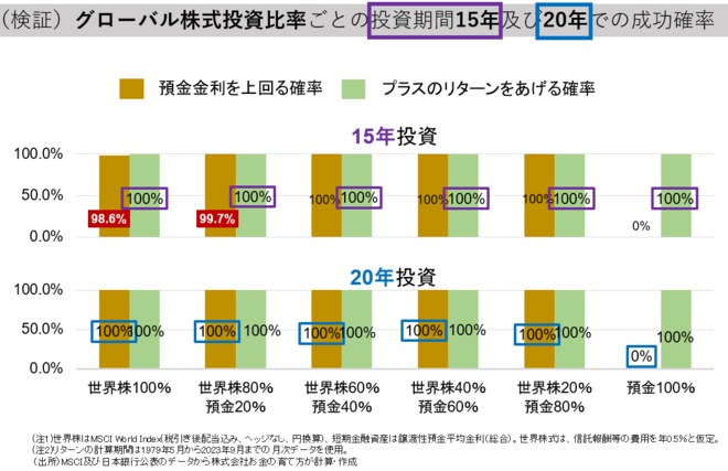 先ほどは投資期間10年を想定しましたが、今度は同じデータを用いて投資期間15年ならびに20年でその変化を見て見ます。株式投資比率の高低にかかわらず、15年投資であれば全ての組み合わせでプラスのリターンを生んでいますし、20年投資であれば全ての組み合わせ(預金100%は除く)で預金金利を上回る成果につなげています。