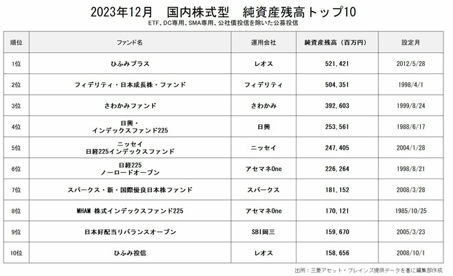 国内株式型の純資産高1位は「ひふみプラス」(5214.21億円)