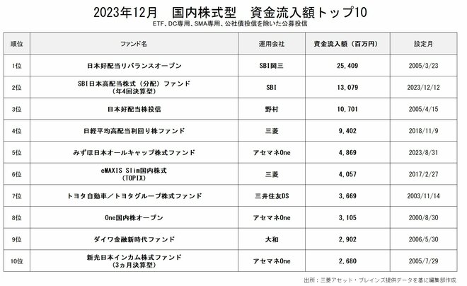 国内株式型の資金流入額1位は「日本好配当リバランスオープン」(254.09億円)