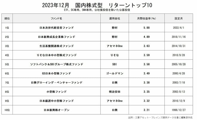 国内株式型のリターン1位は「日本次世代経営者ファンド」(5.88%)