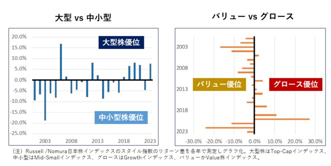 2000年以降の日本株市場における投資スタイル間のリターン格差をグラフで表しました。スタイル間のリターン格差は大きく、グロースとバリューの間に1年で20%程度のリターン差がつくこともあります。