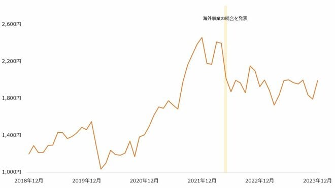【NTTデータグループの株価(月足終値、2018年12月~2023年12月)】