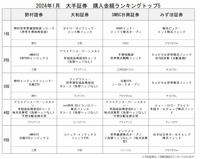 大和証券の「ダイワ・ダイナミック・インド株ファンド」や、みずほ証券の「新光ピュア・インド株式ファンド」など、2024年1月も大手証券ではインド株ファンドの人気が高かった。