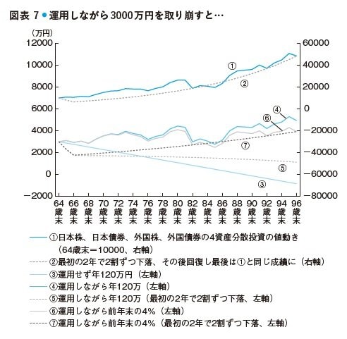 65歳から、バランス型投信などで日本株、日本債券、外国株、外国債券の4資産分散投資を続けながら取り崩しを続けたとします。線①(目盛は右軸)が実際の4資産運用での価格の動きです。