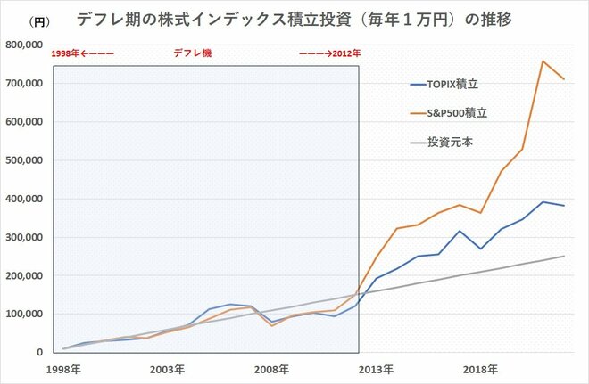 石田は続けて、「デフレの時代は、その期間だけをみれば株式投資にも厳しい時代だったといえるね。その意味では『デフレの時代は預貯金で置いておくのが正しかった』と言っても間違いではないように思う。問題は、それを自らの意志で選択したのかということだと思うよ。結果的に何もしなかったからよかったというのではなく、デフレだから、あえてキャッシュを持っておこうと積極的に現金化する姿勢が大事なんだと思う。デフレの時にも運用を継続し、例えば、積立投資をこの間ずっと行っていたら、物価が上昇し始めた2013年以降で大きな投資成果を得られることになっている。考えて行動し続けたことが成果に結びつくんだということなのじゃないかな」と腕組みをしてうなずいた。