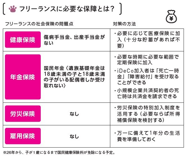 フリーランスが加入できる社会保険制度は、国民健康保険と国民年金のみ。厚生年金保険や労災保険(※)、雇用保険には加入できません。保障内容も手薄です。国民健康保険には、病気やけがで働けない時に支給される傷病手当金や、出産手当金がありません。国民年金では、被保険者の死亡時に支給される遺族基礎年金の対象が、18歳未満の子と、18歳未満の子がいる配偶者に限られます。