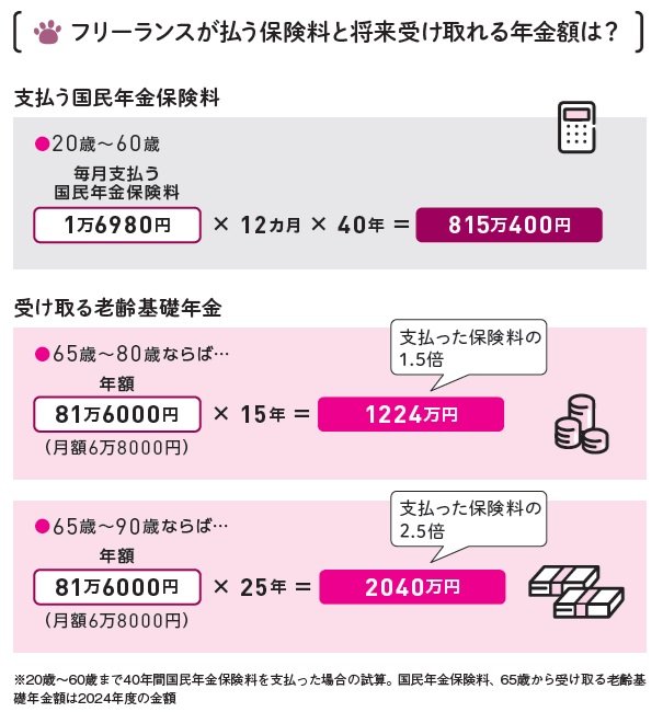 将来受け取る年金額は、年額81万6000円、月額では6万8000円(2024年度)です。65歳から80歳まで受け取った場合には、1224万円と支払った保険料の1.5倍の金額が支給されます。90歳までなら2040万円で2.5倍です。それでも、厚生年金も受け取る会社員や公務員に比べると控えめな金額なので、自分で備えをすることが大切です。
