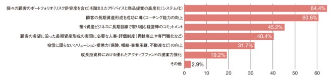 注目すべきは、各社の評価体制に対する意見だ。「新NISAは長期目線での販売が主だが、手数料収入も成績に加味されるため、推進活動においてどちらかに偏るとどちらか捨てなければならなくなる」など、顧客本位の業務運営と自身の評価の優先順位に悩む回答もあり、販売現場における葛藤が垣間見えた。「顧客に新NISAを長期活用してもらえるために重要だと思うポイント」(図2)についての質問でも、前述の課題を反映する回答があがっており、実際に新制度がスタートし、顧客と対する中で、重要と思える点が課題と紐づいていることがうかがえた。