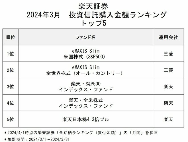 SBI証券のランキング5位は、「iFreeNEXT FANG+インデックス」だった。同ファンドは大和アセットマネジメントが運用する投資信託で、Facebook、Amazon、Netflix、Google(Alphabet)の頭文字をとって「FANG」と呼ばれる次世代テクノロジーをベースにしたグローバル社会で影響力と知名度の高い10銘柄の米国企業の株式に等金額投資したポートフォリオで構成されるNYSE FANG+指数(配当込み、円ベース)の動きに連動する投資成果をめざす。原則としてNYSE FANG+指数を構成する全銘柄に投資し、為替変動リスクを回避するための為替ヘッジは原則として行わない運用方針となっている。2月末時点の1年騰落率は+99.9%となっており、高いパフォーマンスから、3月以降もSBI証券のランキング上位に入る可能性は高いだろう。