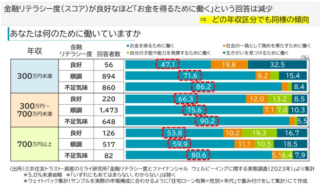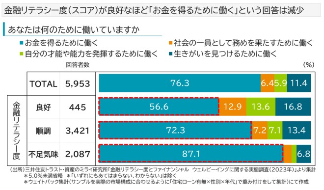 [図表3]は、「資産のミライ健康診断」のスコアと「働き方」の関係について、三井住友トラスト・資産のミライ研究所が実施したアンケート調査から作成したものである。「金融リテラシー度」が良好なほど「お金のために働く」という回答が減少していることが分かる。このグラフだけでは、金銭的に余裕がある人ほど、金融機関との接触も多く「金融リテラシー度」が高くなりがちで、また、余裕がある人は、そもそも「お金を得るために働く」という回答が減るという解釈もできる。