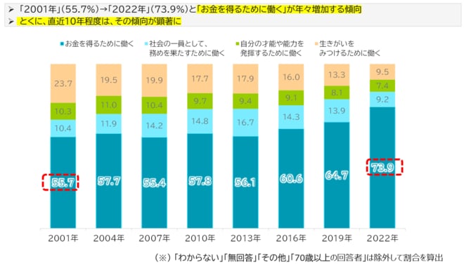 足元の10年というと、「老後資金2000万円」問題がクローズアップされたこともあり、50~60代にとっては「セカンドライフの資金準備」のためという考えが強くなったり、また、若い20代では、返済義務のある「奨学金」を持ったまま社会人になるケースが年々増加しているなど、何れのケースも「お金」に関わる問題であり、「お金のために働く」という人を増加させるように作用している面があるように思える。