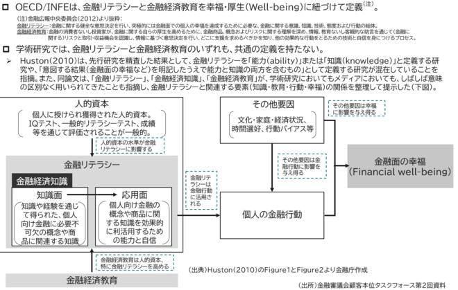 また、「金融審議会顧客本位タスクフォース第2回資料」から抜粋した[図表2]によれば、OECD/INFEは、金融リテラシーと金融経済教育を「幸福・厚生(Well-being)」に紐づけて定義しており、知識面だけではなく応用面、そして「個人の金融行動」までいって、初めて「金融面の幸福(Financial Well-being)」につながると捉えている。