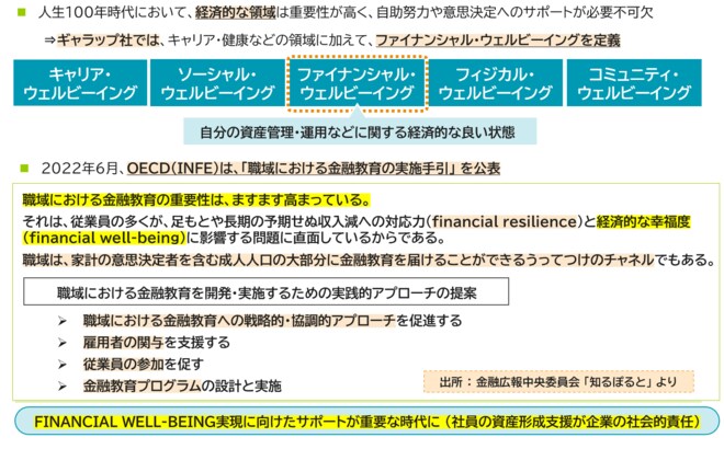 米国ギャラップ社は、ウェルビーイングを五つの要素に分解したうちの一つを「ファイナンシャル・ウェルビーイング(FINANCIAL WELL-BEING)」としている。このファイナンシャル・ウェルビーイング向上には金融教育の充実が欠かせない。