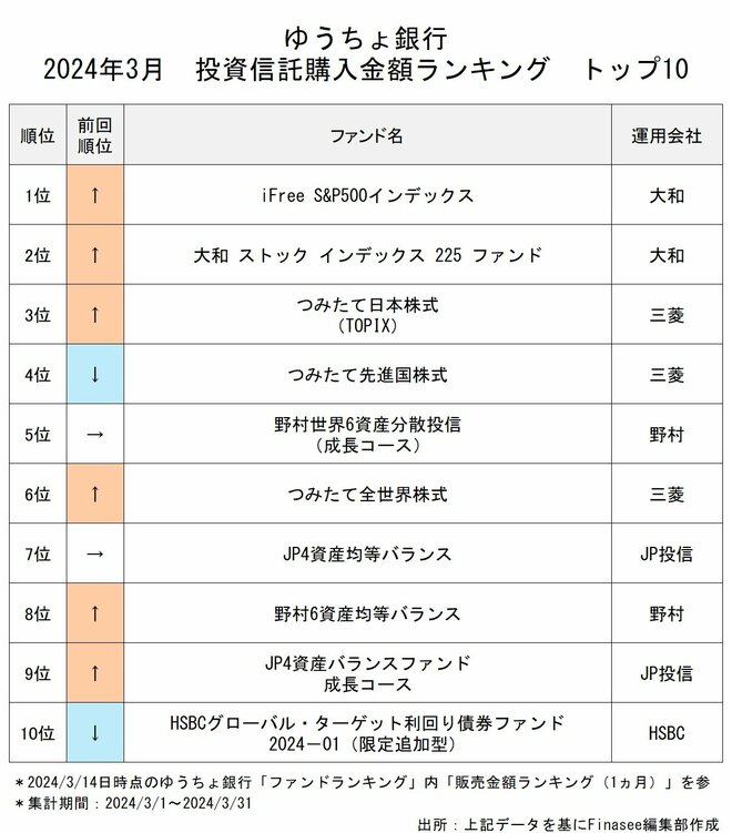 2024年3月、ゆうちょ銀行で多くの資金を集めたのは以下のファンドだった。