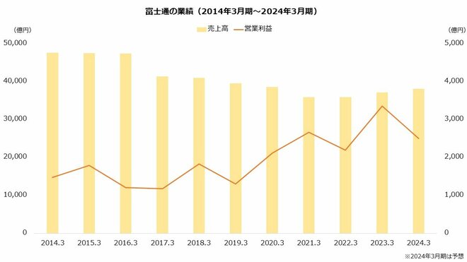 直近で売り上げを伸ばす富士通ですが、実は長期でみると減収傾向にあります。国際会計基準に移行した2014年3月期以降、売り上げは2022年3月期まで8期連続で減少しました。