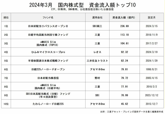 国内株式型の資金流入額1位は「日本好配当リバランスオープンⅡ」(236.69億円)