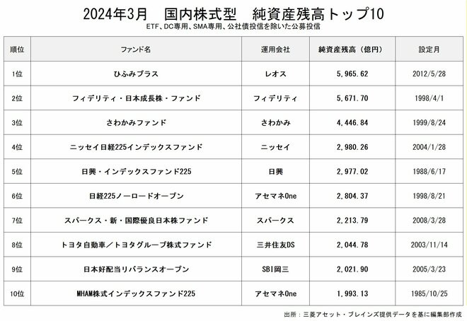 国内株式型の純資産残高1位は「ひふみプラス」(5965.62億円)