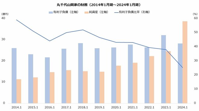 山岡家の有利子負債は横ばいの状況です。しかし有利子負債比率は低下傾向にあります。2024年1月期までの10期で33.8%ポイント改善されました。これは利益の蓄積によって純資産および総資産が増加し、相対的に有利子負債が小さくなったことが理由です。