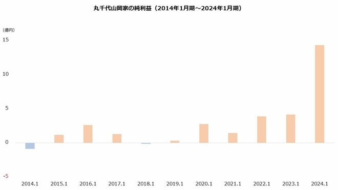 山岡家の純利益は前期比のおよそ3.5倍に増加しました。不採算店舗の減損などから、2018年1月期は最終赤字となっていました。2024年1月期は減損が1店舗にとどまったことも、大きな最終利益を残すことができた理由です。