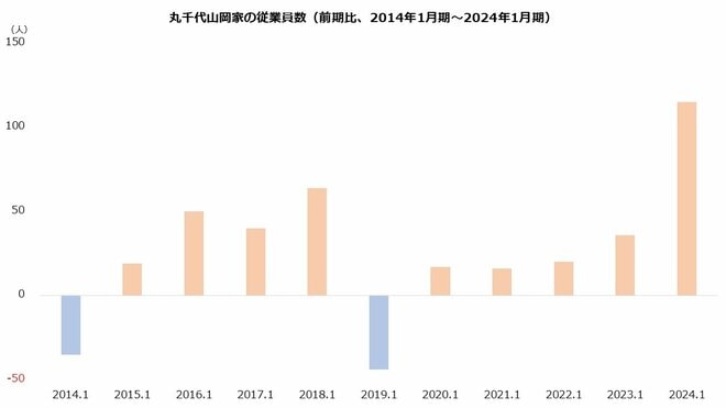 今期の取り組みで目を引くのが採用計画です。年間で200人以上の中途採用を見込んでいます。2024年1月末の従業員は558人でした。計画通りなら、1年で35%以上増やす大幅な増員となります(出所:丸千代山岡家 決算説明会資料)。