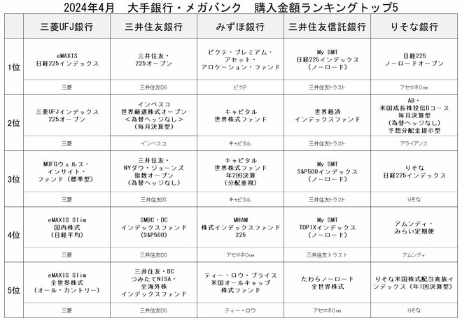 大手銀行では、4月も日経平均株価を対象にしたインデックスファンドの人気が高かった。4月の日経平均株価は1963円78銭(4.9%)下落し、2022年9月以来1年7カ月ぶりの大幅な下げを記録した。この下落は4カ月ぶりである。下落の主な要因は、米国の利下げ期待が後退したことによる米長期金利の上昇で、これにより世界的な株高の勢いが弱まった。そして、東京株式市場でも、幅広い銘柄に利益確定の売りがでたのである。
