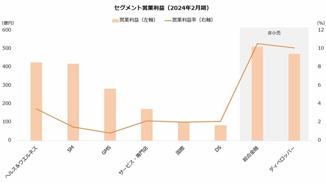 ドラッグストアは好採算の事業です。イオンの小売事業において、ドラッグストアのヘルス&ウエルネスは営業利益、営業利益率ともに最大です。