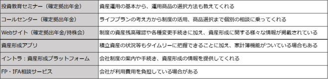サービス内容はセミナーやコールセンター、ウェブサイト、資産形成アプリなど、企業によって様々です。中にはファイナンシャルプランナーやIFA(独立系ファイナンシャルアドバイザー)と言われる専門家に資産運用の相談ができて、なおかつその費用を職場が持ってくれるところもあります。