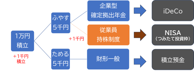 例えば企業型確定拠出年金がない場合は、個人で使えるiDeCo(個人型確定拠出年金、イデコ)が代わりになります。従業員持株制度がない場合はNISAで積立投資を行う方法があるでしょう。財形一般がない場合は、銀行の積立預金という手も使えるかもしれません。