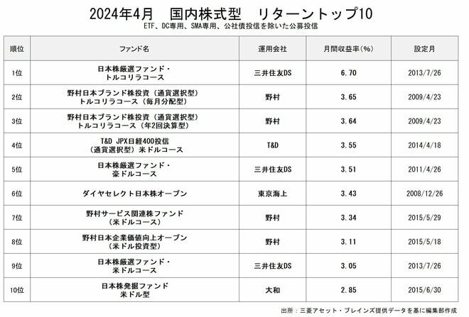 国内株式型のリターン1位は「日本株厳選ファンド・トルコリラコース」(6.70%)