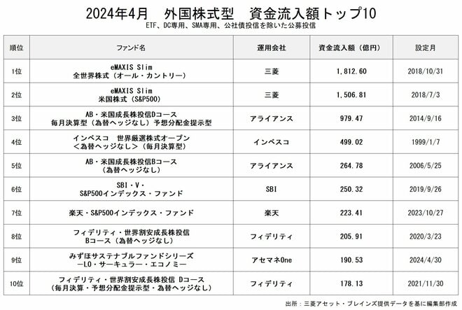 4月の外国株式型の資金流入額1位は、「eMAXIS Slim全世界株式(オール・カントリー)」だった。三菱UFJアセットマネジメントが運用する「eMAXIS Slim(イーマクシス スリム)」シリーズの合計純資産総額は、2024年5月15日に10兆601億円に達し、10兆円の大台を突破した。同シリーズは設定以来、その純資産総額を順調に伸ばしている。2023年11月13日には6兆円を突破し、2024年に入ってからは株式市場の好調や新NISAを背景に資金流入ペースが加速。その結果、1月から3月にかけて月1兆円ずつ純資産総額を増やし、3月28日には9兆円の大台を突破した。4月に入り、株式市場の勢いがやや弱まったことから、純資産総額の伸びペースは若干鈍化したものの、それでもわずか1ヵ月半ほどで1兆円増加し、ついに10兆円の大台を突破したのである。