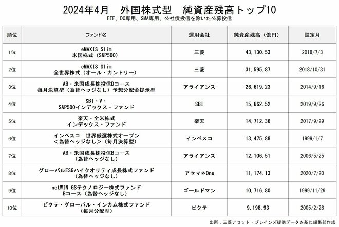 外国株式型の純資産残高1位は「eMAXIS Slim 米国株式(S&P500)」(4兆3130.53億円)