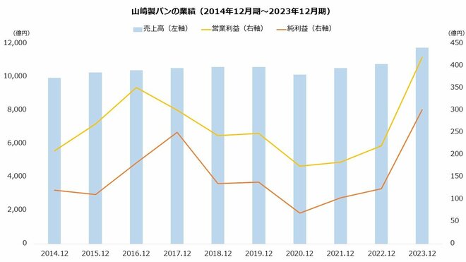 山崎製パンの2023年度は大幅な増益でした。営業利益は1.9倍、純利益は2.4倍に増加しています。営業利益、純利益はともに過去最高とみられます。最高益の更新は2017年度以来6期ぶりです。