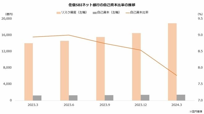 自己資本比率は7.7%となりました。上場時の9%からは低下傾向にあります。リスク資産の増加によるものですが、これは貸し出しの増加が一因だと考えられます。国内基準行である住信SBIネット銀行は、原則4%以上の自己資本比率が求められます(参考:日本銀行 銀行の自己資本に関する国際統一基準(バーゼル合意に基づく基準)と国内基準の違いを教えてください。)。