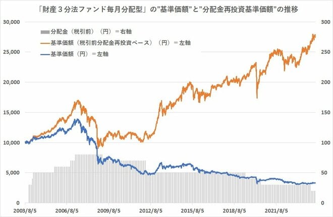 分配金を再投資すると決意した時、投資信託の基準価額は4800円程度になっていて、資産評価額は2000万円程度に減額していた。これまでに分配金として600万円ほどを受け取っていたため、収支としてはトントンといえた。そして、分配金を再投資するようになると、資産価値はグングンと増えていった。